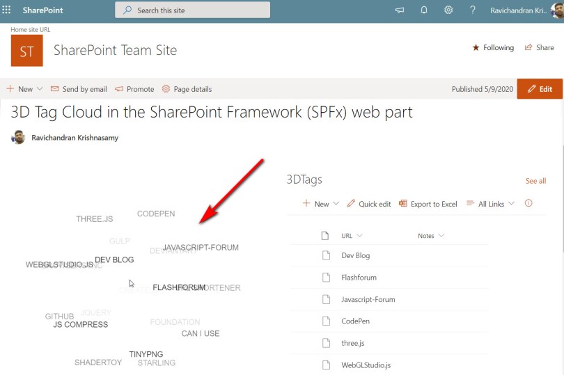 SharePoint Online 3D Tag Cloud in the SharePoint Framework (SPFx) web part May 9, 2020October 13, 2025 Ravichandran Krishnasamy3 Comments π This article has moved! Please visit the updated version here: π Go to Updated Article Share this: Click to share on Facebook (Opens in new window) Facebook Click to share on X (Opens in new window) X Click to share on LinkedIn (Opens in new window) LinkedIn Click to share on WhatsApp (Opens in new window) WhatsApp Click to email a link to a friend (Opens in new window) Email Click to print (Opens in new window) Print Like Loading... Related