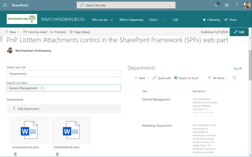 SharePoint Online PnP ListItem Attachments control in the SharePoint Framework (SPFx) web part May 21, 2020October 13, 2025 Ravichandran KrishnasamyLeave a comment π This article has moved! Please visit the updated version here: π Go to Updated Article Sharing is caring! If you have any questions, feel free to let me know in the comments section. Happy coding!!! Share this: Click to share on Facebook (Opens in new window) Facebook Click to share on X (Opens in new window) X Click to share on LinkedIn (Opens in new window) LinkedIn Click to share on WhatsApp (Opens in new window) WhatsApp Click to email a link to a friend (Opens in new window) Email Click to print (Opens in new window) Print Like Loading... Related