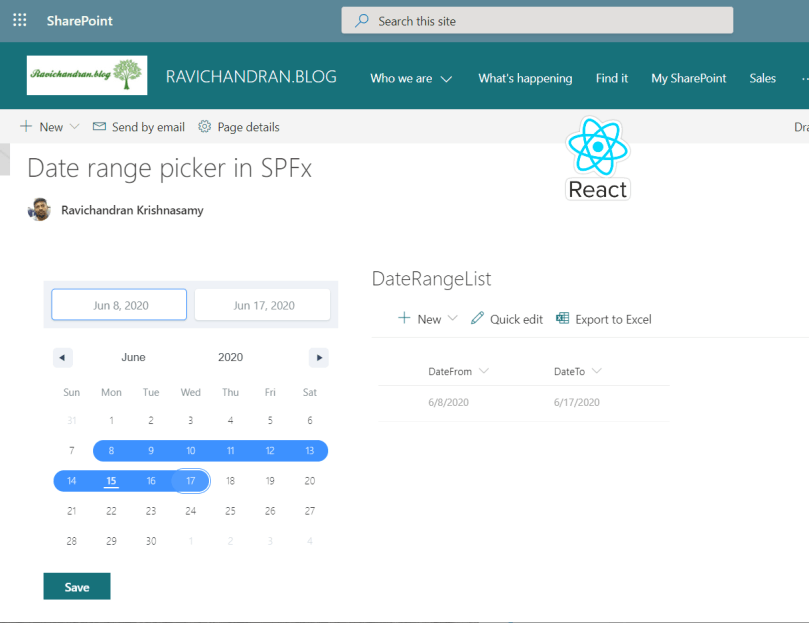 SharePoint Online Date range picker in SPFx June 14, 2020October 16, 2025 Ravichandran KrishnasamyLeave a comment π This article has moved! Please visit the updated version here: π Go to Updated Article Share this: Click to share on Facebook (Opens in new window) Facebook Click to share on X (Opens in new window) X Click to share on LinkedIn (Opens in new window) LinkedIn Click to share on WhatsApp (Opens in new window) WhatsApp Click to email a link to a friend (Opens in new window) Email Click to print (Opens in new window) Print Like Loading... Related