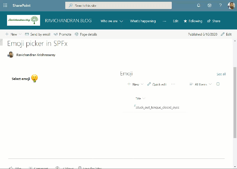 SharePoint Online Emoji picker in SPFx June 15, 2020October 16, 2025 Ravichandran KrishnasamyLeave a comment π This article has moved! Please visit the updated version here: π Go to Updated Article Share this: Click to share on Facebook (Opens in new window) Facebook Click to share on X (Opens in new window) X Click to share on LinkedIn (Opens in new window) LinkedIn Click to share on WhatsApp (Opens in new window) WhatsApp Click to email a link to a friend (Opens in new window) Email Click to print (Opens in new window) Print Like Loading... Related