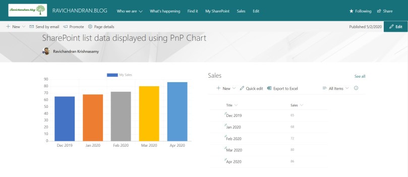 SharePoint list data displayed using PnP Chart in the SharePoint Framework (SPFx) webpart May 2, 2020October 13, 2025 Ravichandran Krishnasamy12 Comments π This article has moved! Please visit the updated version here: π Go to Updated Article Share this: Click to share on Facebook (Opens in new window) Facebook Click to share on X (Opens in new window) X Click to share on LinkedIn (Opens in new window) LinkedIn Click to share on WhatsApp (Opens in new window) WhatsApp Click to email a link to a friend (Opens in new window) Email Click to print (Opens in new window) Print Like Loading...
